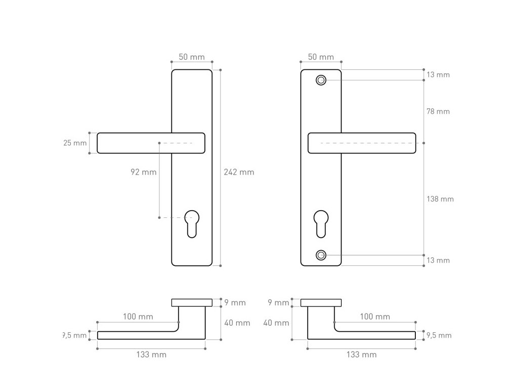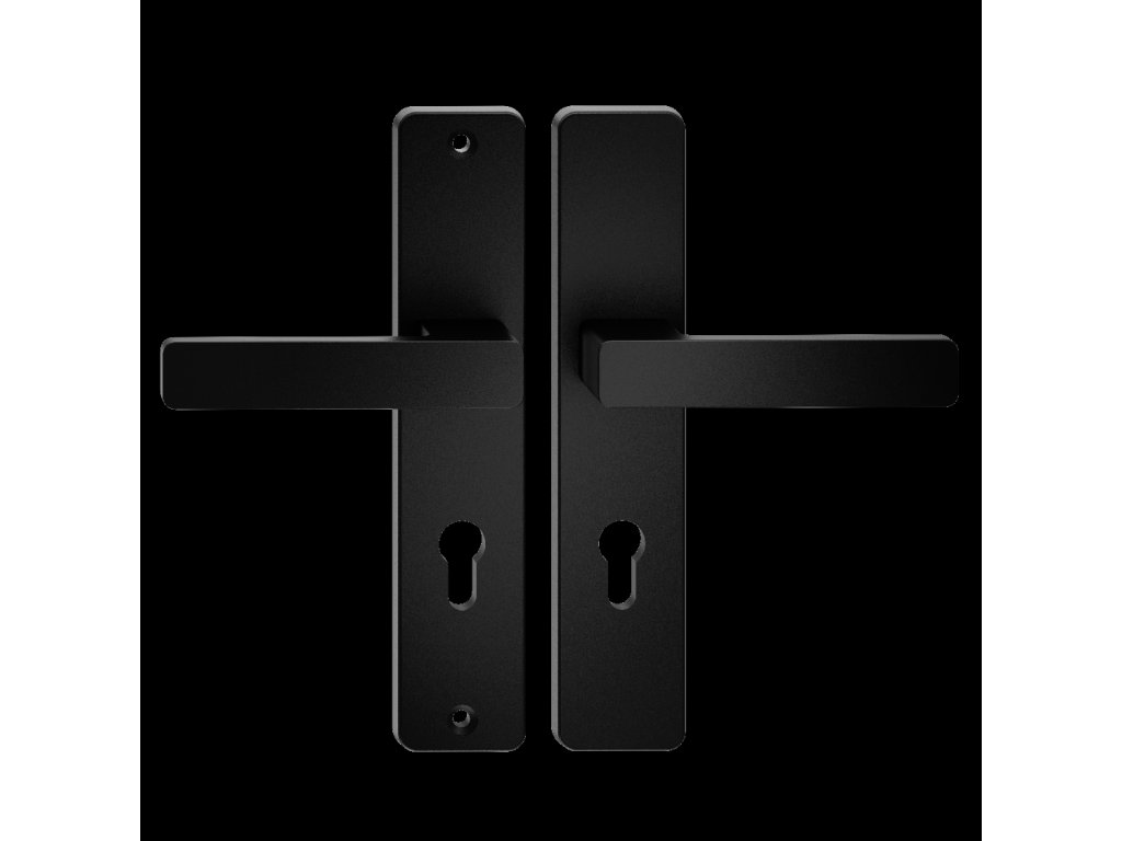 Montážne otvory pre kľučku a horný štít sú usporiadané univerzálne, čo umožňuje montáž na väčšinu vonkajších dverí dostupných na trhu.